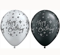 Balon QL 11" z nadr. "Happy Birthday", metalik czarny i srebrny