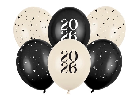Balony Strong, zestaw zawiera 6 balonów (1 w kolorze Pastel Black z nadrukiem ''2026'', 2 w kolorze Pastel Black w gwiazdki, 1 w kolorze Pastel Nude z nadrukiem ''2026'', 2 w kolorze Pastel Nude w gwiazdki), średnica ok. 30 cm. (1 op. / 6 szt.)Szerokość towaru w centymetrachWięcejSzerokość towaru w centymetrach