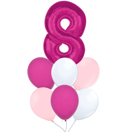 - Zestaw balonów z helem: cyfra (do wyboru) + 6 balonów lateksowych w kolorze różowym i białym. Idealny na urodziny oraz jubileusze.