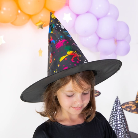 To kapelusz czarownicy idealny dla magicznej osoby z kolorową duszą. Wyróżniające się na czarnym tle, pobłyskujące kolorami wzory dyń kotów, czarownic i nietoperzy będą inspiracją do wspaniałego stroju wiedźmy na zabawę w Halloween. Uniwersalny rozmiar sprawia, że kapelusz może być elementem przebrania zarówno dziecka jaki i osoby dorosłej.