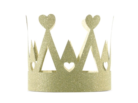 - Złota korona z brokatowego papieru, o wysokości około 10 cm i średnicy 11 cm. Pasuje jako element stroju na urodziny, Roczek lub świąteczne przyjęcia. Wyróżni solenizanta i sprawdzi się do pamiątkowych zdjęć.