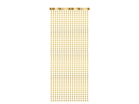 - Kurtyna z folii w złotym kolorze z motywem gwiazdek o wymiarach 100 cm x 245 cm. Posłuży jako dekoracja ściany lub tło do zdjęć na przyjęciu, pasuje również do świątecznego wystroju.