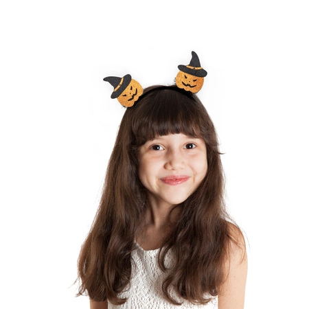 Dwie małe błyszczące dynie w czarnych kapelusikach z groźnymi minami będą się doskonale prezentowały na zabawie w Halloween. Z tyłu każdej dyni zostały umieszczone czarne pomponiki co dodatkowo uatrakcyjnia wygląd opaski na głowę.
