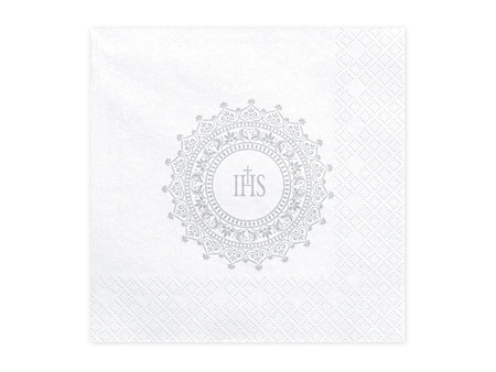 Serwetki komunijne papierowe białe ze srebrnym nadrukiem IHS, wymiary po rozłożeniu ok. 33 x 33 cm, wymiary po złożeniu ok. 16,5 x 16,5 cm. (1 op. / 20 szt.)Podmiot odpowiedzialny za ten produkt na terenie UE