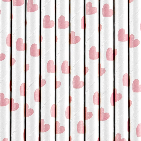 Zestaw 10 białych słomek papierowych, ozdobionych delikatnymi jasnoróżowymi sercami, to stylowy dodatek na każdą romantyczną uroczystość. Słomki mają długość 5 cm i są przeznaczone do serwowania napojów, wzbogacając ich wygląd.
