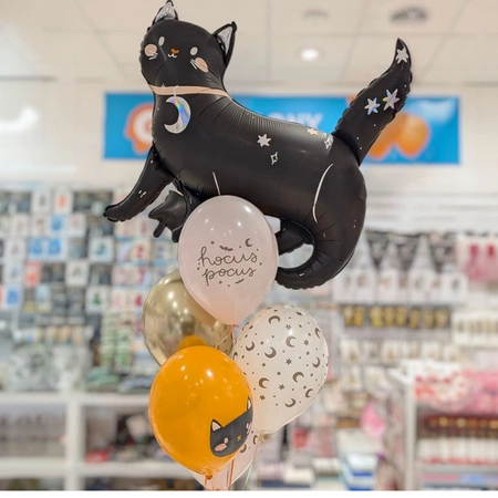 - Czarny balon foliowy w kształcie kota z holograficznym nadrukiem to efektowna dekoracja na Halloween. Świetnie podkreśli klimat imprezy i przyciągnie wzrok gości. Dodaj do koszyka i sprawdź efekt na żywo.